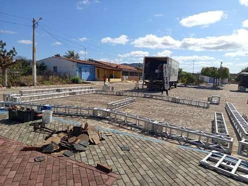 Começou a ser montada, na manhã desta sexta-feira (10), a estrutura metálica que vai abrigar o palco, camarins, som e telões de led para os shows musicais da Tradicional Festa do Rosilho, edição 2025.