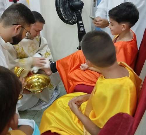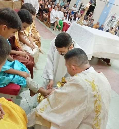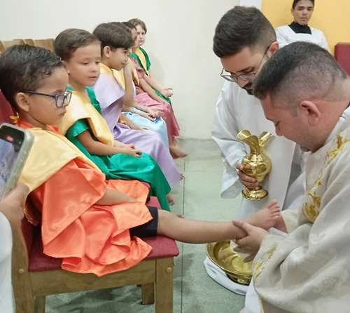 O padre, André Ferreira lavou, secou e beijou os pés de 12 crianças de Quixaba/PE, no Sertão do Pajeú, na cerimônia de Lava-Pés, que é um dos rituais da Quinta-feira Santa.