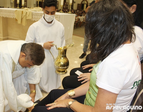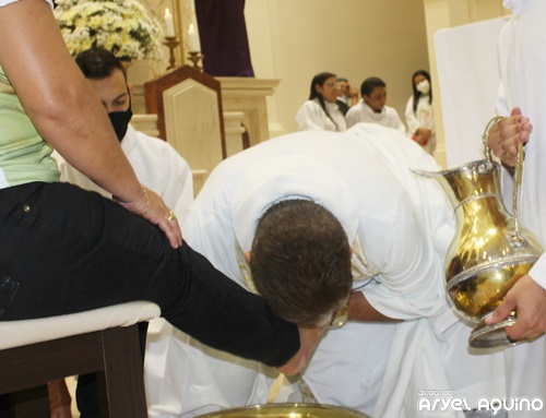Ainda segundo Bíblia, após a ceia, Cristo lavou os pés seus 12 discípulos, dando a eles o exemplo de humildade uns com os outros. Para relembrar essa passagem, durante a missa, o padre, Fábio de Abreu Lima, lavou, secou e beijou os pés de doze educadores do município, sendo seis homens e seis mulheres.